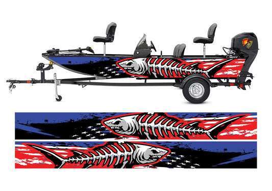 Distressed American Flag & Shark Fishbones Modern Lines Graphic Boat Vinyl Boat Wrap Fishing Pontoon Sportsman Tenders Skiffs Bowriders Deck Boats Sea Water Watercraft Decal